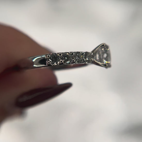 Expertly crafted in 14K white gold, this semi mount is designed to showcase a stunning round center diamond weighing 1 carat. With 5/8 carats of sparkling diamonds accenting the band and setting, this mount will enhance the brilliance of your chosen center stone and make for a beautiful engagement ring.