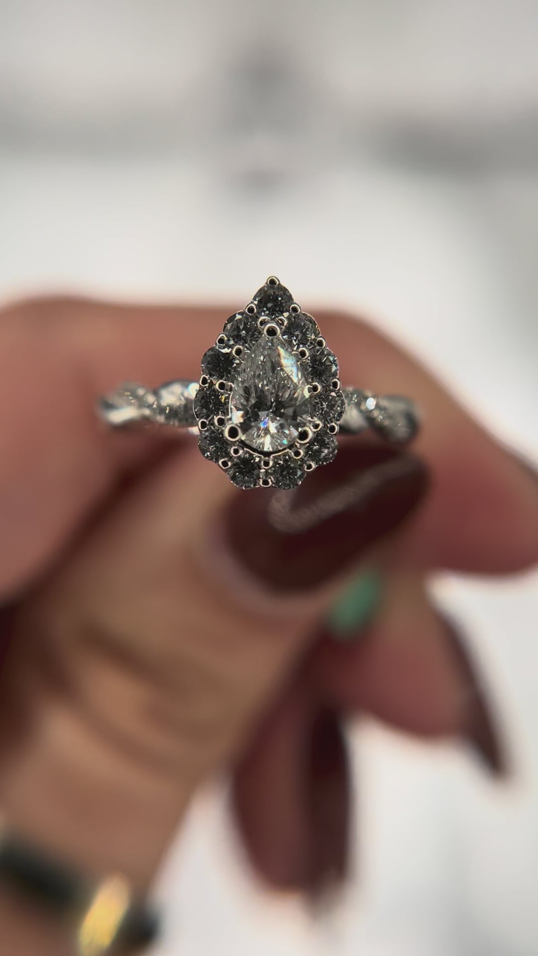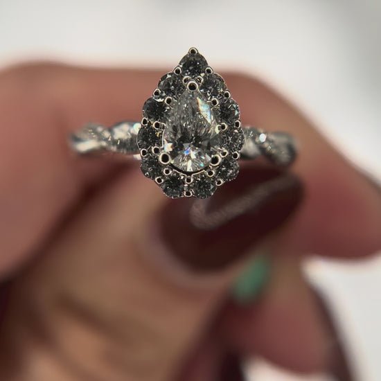 14K White Gold Lab Grown .40ct Pear Center Twist Ring with Round Halo